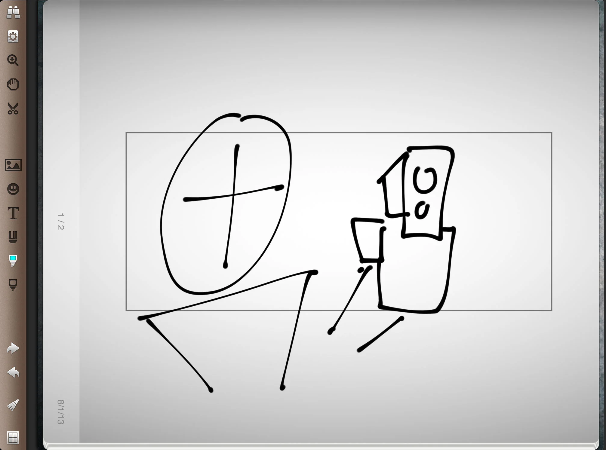 But Noteshelf is not just a me-too app. It’s sturdy, attractive, well thought-out, and not without restraint. And there are a few things about it that I like better than Penultimate. Its “ink” overlaps more realistically. It features highlighter “markers” that are great for shading storyboards. And it works much better in landscape orientation.